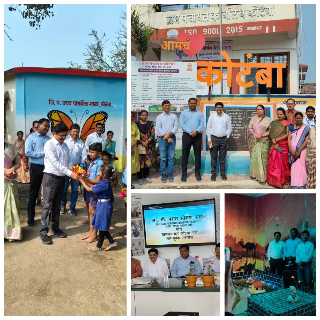 पं.स. सेलू ग्रा.पं.कोटंबा येथे मुख्यमंत्री समृद्ध पंचायत राज अभियांना अंतर्गत मा. श्री पराग सोमण सर मुख्य कार्यकारी अधिकारी, मा. श्री अमोल भोसले उप मुख्य कार्यकारी अधिकारी यांनी जिल्हा परिषद शाळा, अंगणवाडी, ग्रामपंचायत, परसबाग व ग्रंथालय येथे भेट दिली. मा.मुख्य कार्यकारी अधिकारी सर यांच्या हस्ते संविधान प्रत नागरिकांना वाटप करण्यात आल्या तसेच घरकुल चे उदघाट्न व PMAY घरकुल लाभार्थी यांना सोलर चे प्रमाणपत्र चे वाटप करण्यात आले. श्री देवानंद पानबुडे गट विकास अधिकारी, श्री रामचंद्र चोपडे सहा. गट विकास अधिकारी, श्री बर्डीया विस्तार अधिकारी ग्रामपंचायत अधिकारी श्री कंटाळे, श्री नंदनवार प्रशासक माजी सरपंच श्रीमती कोटंमकर माजी सरपंच उपस्थित होते.